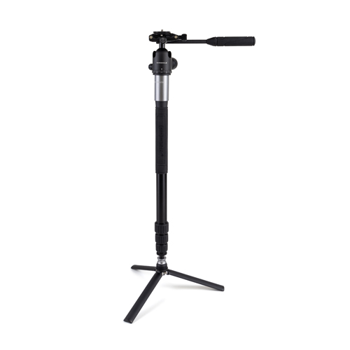 In place of a standard center column, the Chronicle features an entirely new design. With a camera or phone attached to the head, turn the knob on the side of the Chronicle’s yoke and then pull up on the ball head; the assembly easily lifts out of the tripod to form a comfortable, round handheld stabilizer. Open the Flexor’s legs, and the unit becomes a tabletop or ground level tripod! That’s not all. Detach one of the tripod’s legs to form a traditional monopod by installing the upper portion of the Flexor, with the ball head still attached, to the top of the leg. Unscrew the standard rubber foot from the monopod leg and install the Flexor’s bottom section, and gain a monopod with a sturdy 3-leg base! This base has a built-in ball joint for smooth panning and tilting, as well as a locking collar on the ball joint allows panning movements without tilt.Just like the amazing ball head, the Flexor requires no outside accessories or special tools to convert into its various forms.