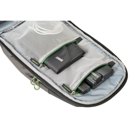 Access to the main compartment is provided by a front-facing zippered panel with a 180° downward opening. Along the inside of that zippered panel are two zippered, mesh organizer pockets which can be used to hold hard drives, portable batteries, camera filters, or small electronics. Integrated within the main compartment’s zippered panel is a front-facing, zippered accessory pocket. This pocket includes both a dedicated laptop compartment and a dedicated tablet computer pocket that can accommodate a 13.0″ laptop and a 10.0″ tablet computer respectively; while a tablet computer placed inside its pocket is further secured by a hook-and-loop tab. The accessory pocket also includes multiple organizational pockets for pens, business cards, or tools plus an additional 6L of capacity, which can be used for books, notepads, or packable clothing. In front of the accessory pocket is a small pocket for items that need to be accessed quickly and conveniently, such as a pair of sunglasses or a smartphone with up to a 5.5″ screen.