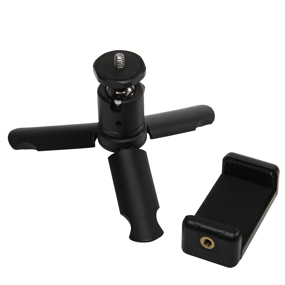 Supports compact cameras – Metal Ball Head rotates 360° – Compact and easy to carry – Fully adjustable Ball Head – Durable construction – Works great as a grip for videos – Rubber feet – Phone Mount – Phone Mount fits standard and plus size phones – Built-in “pull out” table stand – Accessory cold shoe – Rubberized grips to secure phone