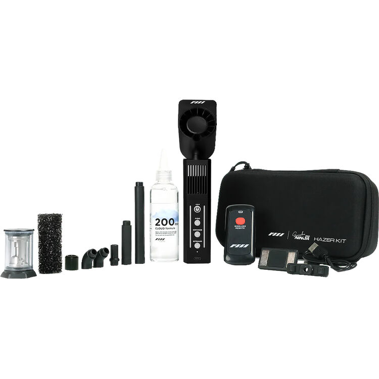 Create cinematic dry ice, haze, fog, and steam effects instantly with the PMI Smoke Ninja Pro Hazer Kit, a handheld, battery-powered, wireless mini smoke machine thoughtfully crafted for the creative needs of photographers, videographers, and content creators. The Haze Kit includes the 3rd generation PMI Haze fan, which features Haze Blending technology for an even finer haze than its predecessor. The fan comes with 2.4Ghz pairing and a nozzle attachment for single-hand operation. The Haze Kit can haze up a 1000 ft² studio in two minutes.
