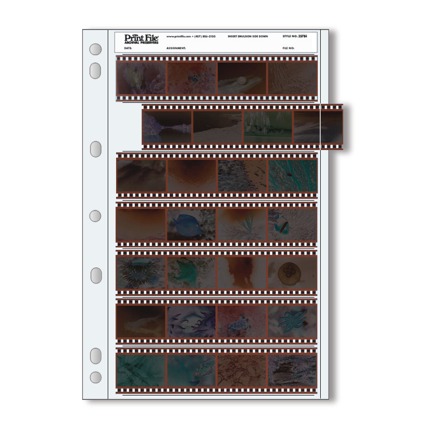 Print File Archival Storage Pages for Negatives have exclusive thin backing coupled with high clarity and allow you to make quality contact sheets without removing or handling negatives. Make contact prints on 8×10. Strong continuous seams prevent negative hang up. Each page holds seven 35mm strips of 4 frames, 28 frames total.
