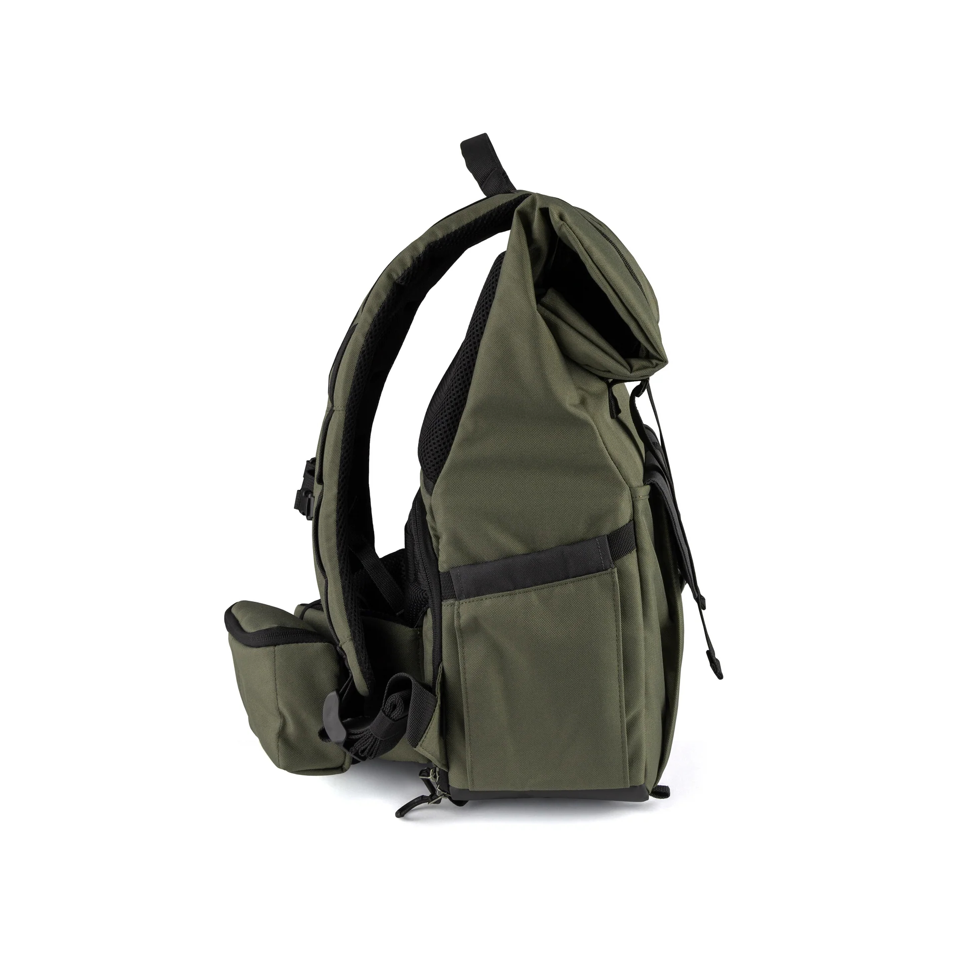 Every inch of space is designed to be useful in a Jasper bag. The outer front has pockets for holding all types of accessories. A detachable lanyard is great for keys. The included rain cover is stored in a convenient zipper compartment at the base of the bag. The side pockets provide places to stash items quickly without having to open the bag. They are especially handy for water bottles, snack bars, or small lenses, a small LED light, or a flash. Inside the rolltop you will find additional accessory pockets and a sleeve for storing a laptop computer, tablet, or other flat items such as pop-up reflectors or exposure cards.