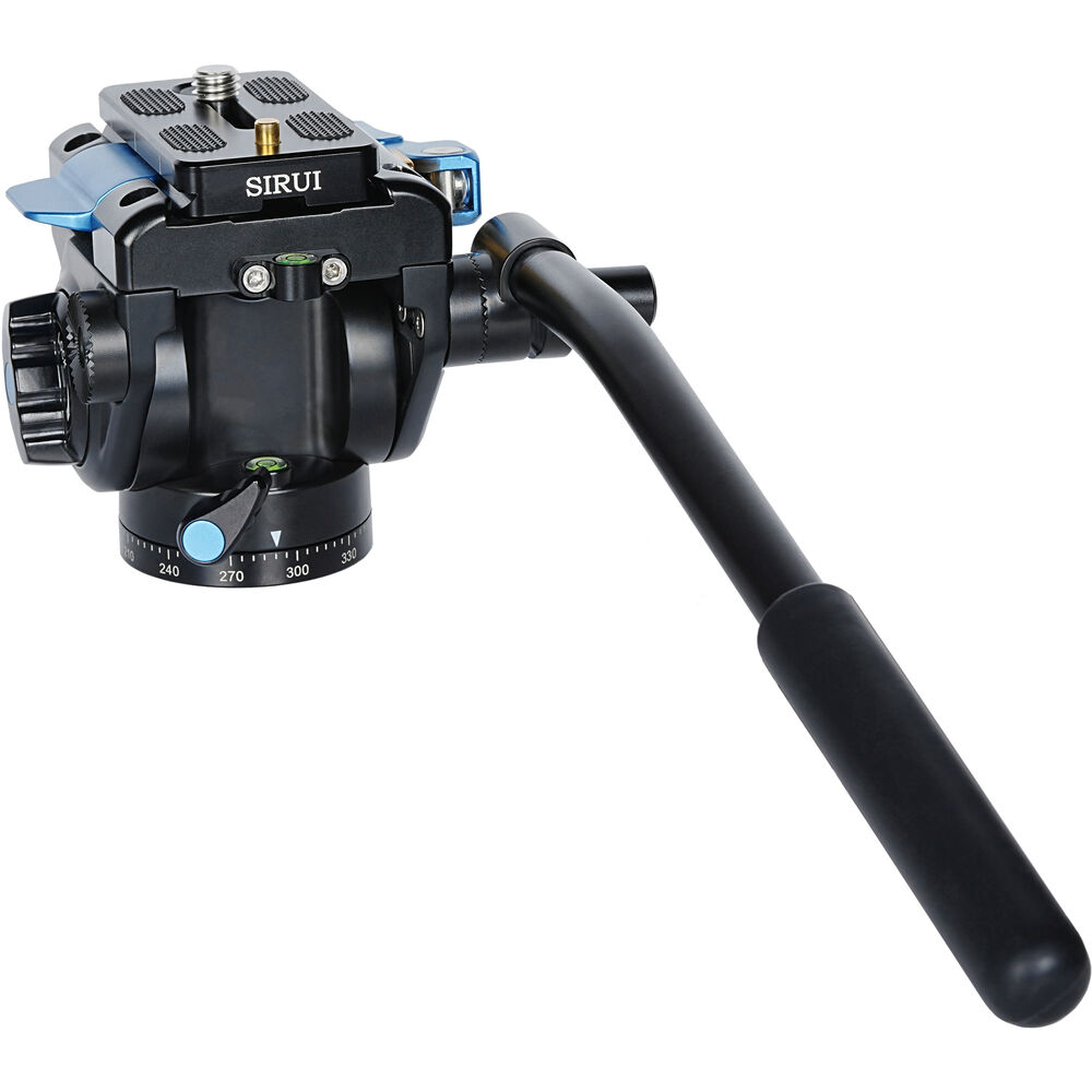 The VA-5X Fluid Video Head with Side-Loading Plate from Sirui uses a fluid system to produce smooth pans and tilts for DSLRs and compact video cameras weighing up to 6.6 lb. It features a side-loading quick release plate with a safety pin that is secured by a large, adjustable tension lever. The VA-5X has independent pan and tilt locks, a detachable pan handle that can be used on either side of the head, two bubble levels, and durable aluminum alloy construction.