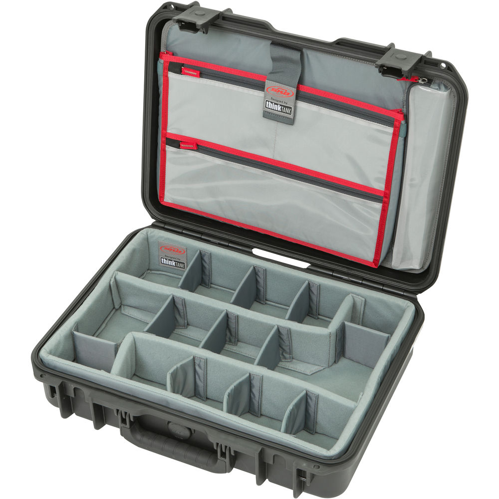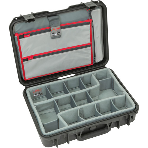 [addtoany]Store, transport, and protect two cameras, up to six lenses, and related accessories in this dust and waterproof SKB iSeries 1813-5 Case with Think Tank Photo Dividers & Lid Organizer. The black case features two trigger latches, two metal-reinforced locking loops for optional padlocks, an automatic ambient pressure-equalization valve, and an oversized top handle. Beneath the lid is an organizer with three zippered clear mesh pockets and a polyester-lined, top-loading pocket that will hold tablets and laptops up to 15″. The lid organizer is attached with touch-fastening fabric.