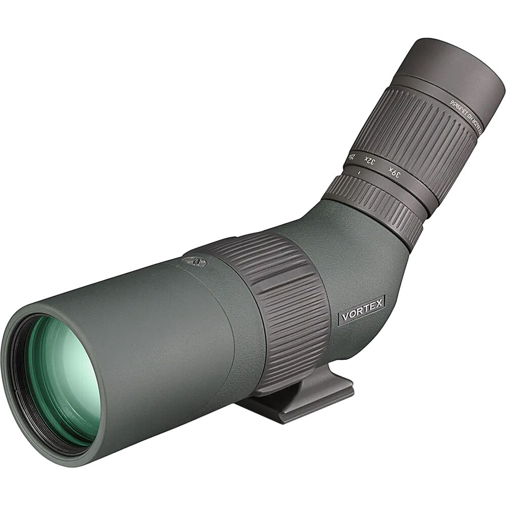 [addtoany]Hunters stalking game and shooters aiming far downrange will appreciate the bright, clear, true-colored imagery of the 13-39×56 HD Razor Spotting Scope from Vortex. The apochromatic index-matched lens elements are designed to optimize light transmission, minimize distortion, and virtually eliminate chromatic aberration. All air-to-glass surfaces have Vortex’s XR antireflective coatings to minimize light loss and the roof prism has dielectric and phase-correcting treatment. External surfaces bear ArmorTek coating for scratch resistance.